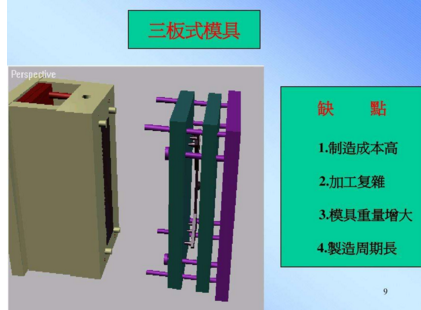 細水口模具又叫三板式模具,的流道及澆口不在分型線上,一般直接在產(chǎn)品上,所以我們在設(shè)計的時候多一組水口分模線,設(shè)計較為復雜,加工較困難,一般要視產(chǎn)品和客戶要求而選用細水口系統(tǒng)。這種模具的澆口位置選擇的地方比較多,而且開模時流道澆口與產(chǎn)品會自動分開,也省去了剪澆口這一步驟,被稱呼為三板式模具
