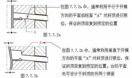 在斜頂機(jī)構(gòu)中,為了保證斜頂工作穩(wěn)定、可靠,應(yīng)該注意以下幾點(diǎn):(A)斜頂?shù)膭傂浴T鰪?qiáng)斜頂剛性一般采用:1.在結(jié)構(gòu)允許的情況下,盡量加大斜頂橫斷面尺寸。(參見(jiàn)第七章7.2節(jié))2.在可以滿(mǎn)足側(cè)向出模的情況下,斜頂?shù)男倍冉恰癆”盡量選用較小角度,斜角A一般不大于20°,并且將斜頂?shù)膫?cè)向受力點(diǎn)下移,如增加圖7.7.1a中的鑲塊2,同時(shí)鑲塊可以具有較高的硬度,提高 模具 的壽命。(B)斜頂橫向移動(dòng)空間。如圖7.7.1a所示尺寸“D”,為了保證斜頂在頂出時(shí)不與膠件上的其它結(jié)構(gòu)發(fā)生干涉,應(yīng)充分考慮斜頂?shù)膫?cè)向分模距離、斜頂?shù)男倍冉恰癆”,以保證有足夠的橫向移動(dòng)空間“D”。(C)斜頂在開(kāi)模方向的復(fù)位。為了保證合模后,斜頂回復(fù)到預(yù)定的位置,一般采用下面的結(jié)構(gòu)形式。如圖7.7.2a;7.7.2b。