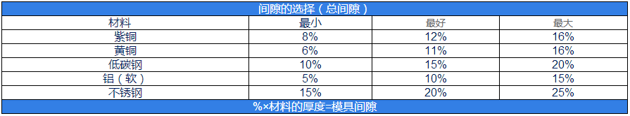 間隙的選擇(總間隙)材料最小最好最大紫銅8%12%16%黃銅6%11%16%低碳鋼10%15%20%鋁(軟)5%10%15%不銹鋼15%20%25%%×材料的厚度=模具間隙